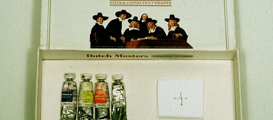 Jars filled with dried and pulverized petals and leaves, rock, gridded paper pad, metal brush, paint tube and feather in wooden box